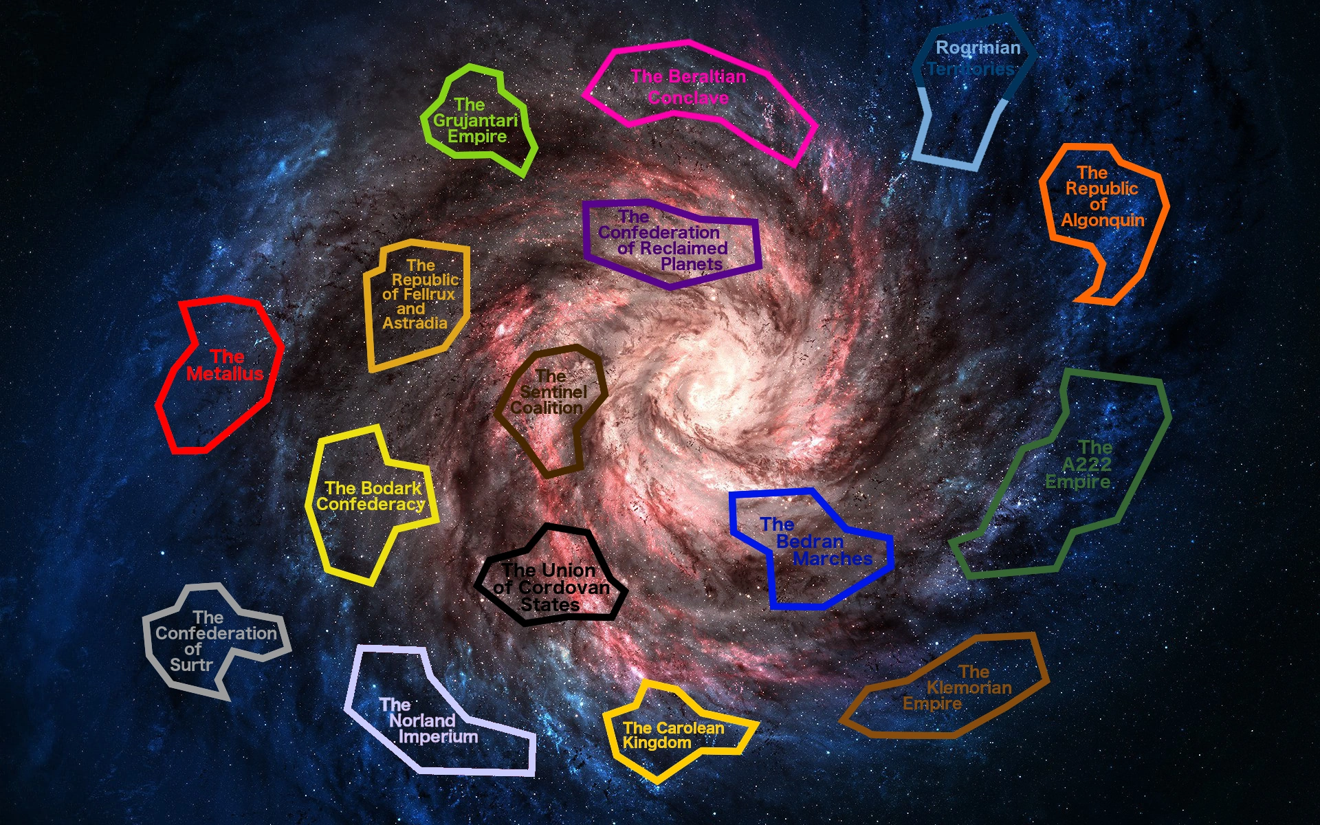 "Rogue Space" is a bit of a misnomer, especially modern times. Throughout much of galactic history, it was a mostly quiet sector of space, inhabited only by fledgling colonies or independent backwater worlds. It was considered a safe haven for exiles, outlaws, marauders and bounty hunters. However, in recent years, Rogue Space has very swiftly adopted a new reputation between the rise of The Metallus and the Fellrux-Astradia, as well as the recent reformation of the Stanislavian people under the Bodark Confederacy. These empires, alongside the Sentinel Coalition and the Union of Cordovan States, make up the bounds of Rogue Space.