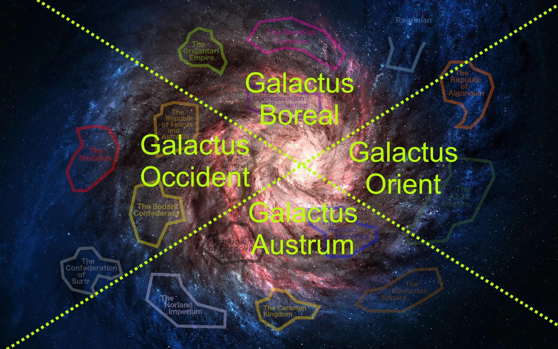 "Elder Space", also known as "The Bystanders", located in the Galactic Boreal, represents the area in which the Grujantari Empire, the Beraltian Conclave, the Rogrinian Empire and the Rogrinian Union are located, as well as the area of space in in the West above the Republic of Fellrux-Astradia and The Metallus. It is known to be where some of the oldest extant civilizations and races still reside. Elder Space is considered to be peaceful relative to the other regions of the Galaxy, though at the cost of becoming somewhat stagnant as a result. In modern times, little of what transpires in Elder Space affects the rest of the Galaxy, and it is believed those that reside there prefer it that way.